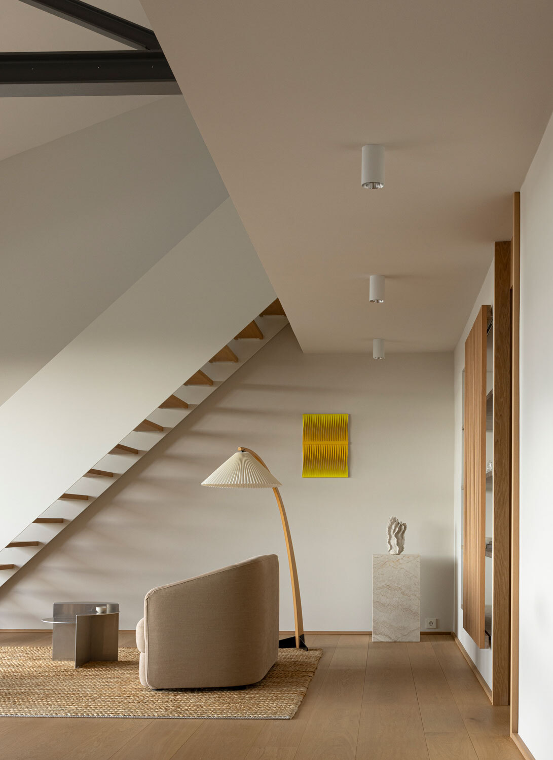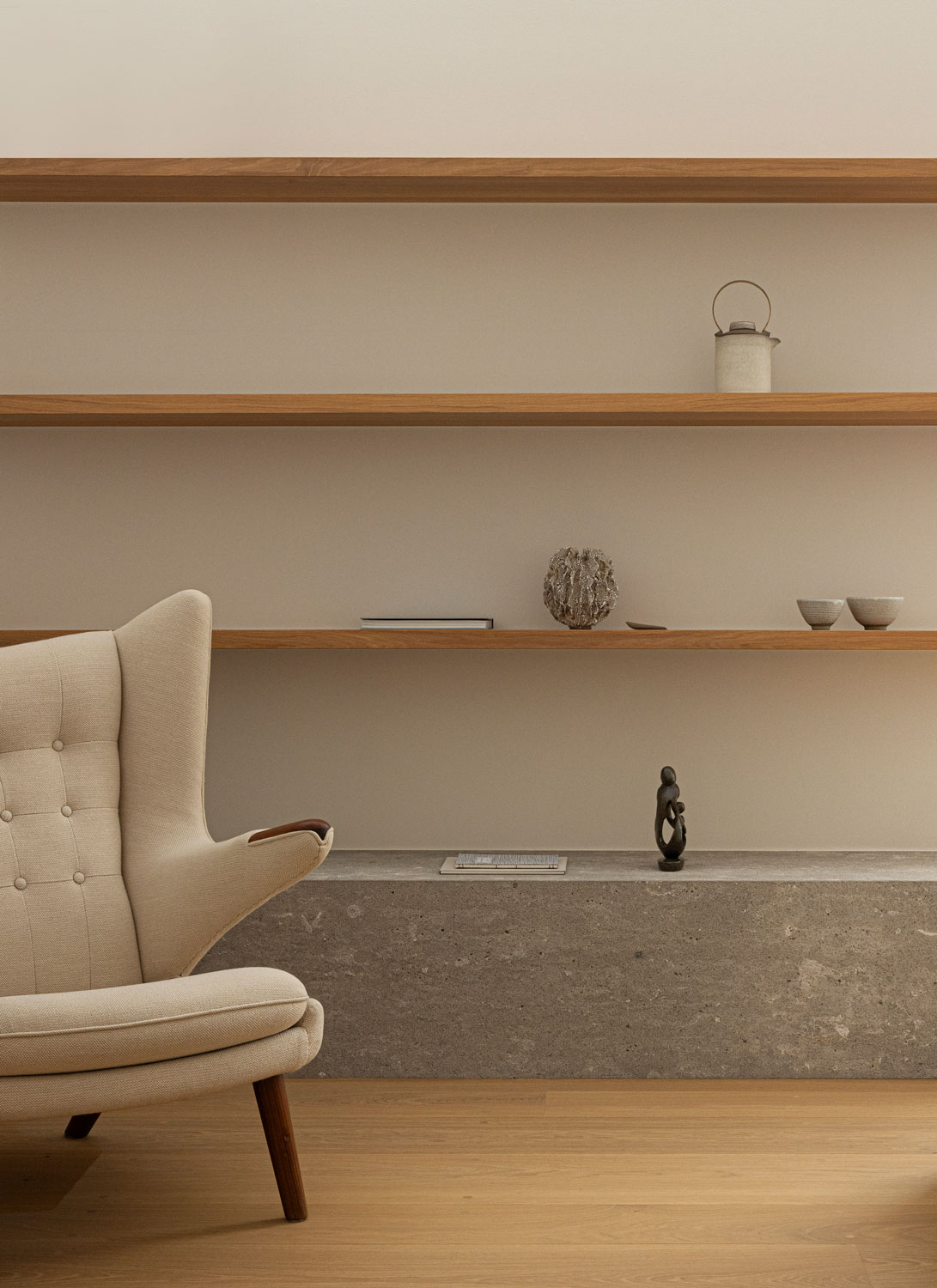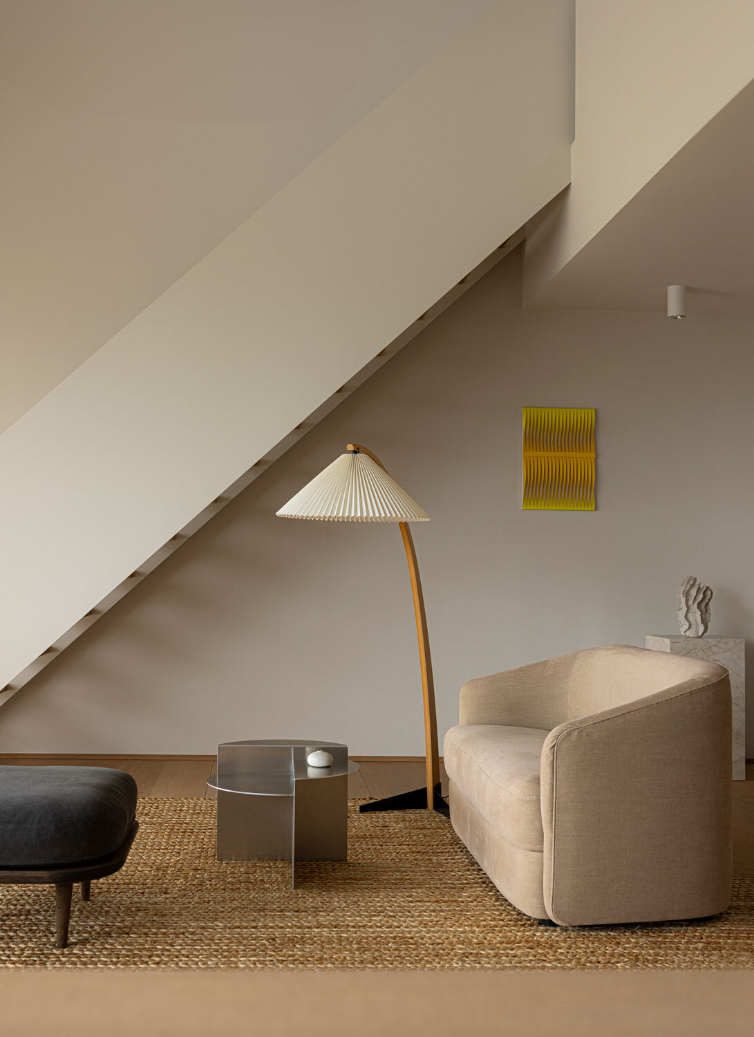 Внутри царит лёгкость: минималистичные формы, мягкие линии и природные материалы превращают интерьер в тихое убежище, где нет ничего лишнего. Панорамные виды за окнами становятся продолжением интерьера, а внутреннее убранство — спокойным холстом, на котором играет жизнь города. Эти апартаменты — не просто жильё, а место, где можно ощутить гармонию противоположностей: тишину и энергию, прошлое и современность, простоту и изысканность.