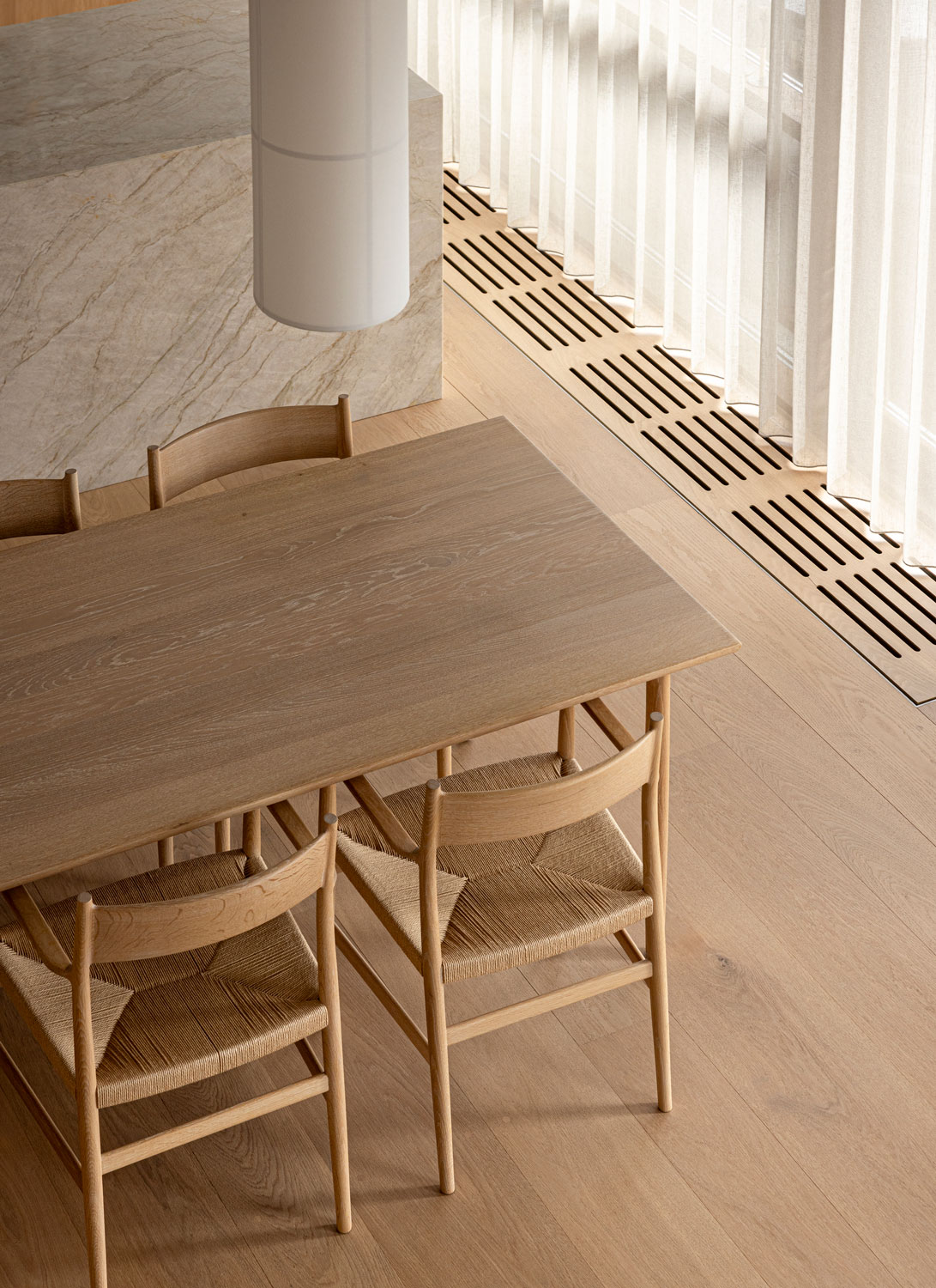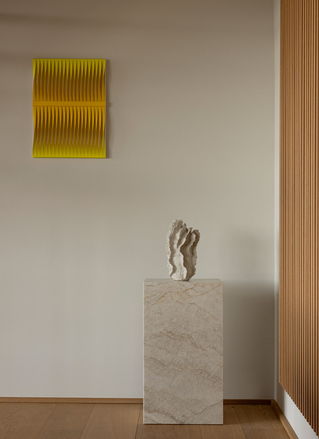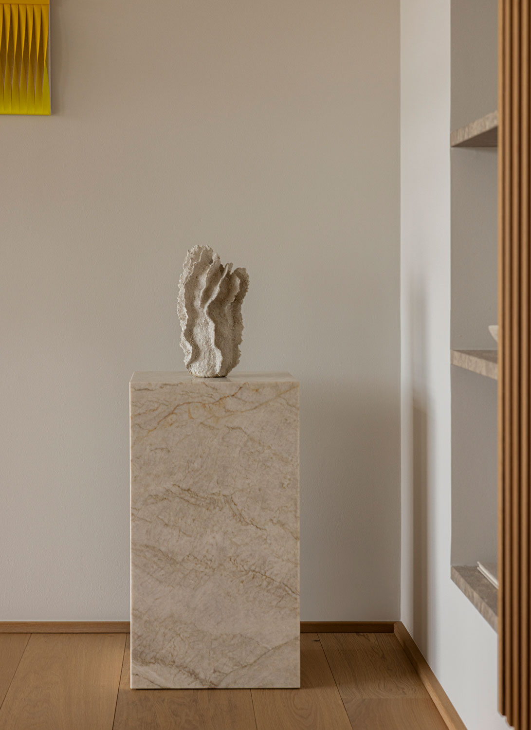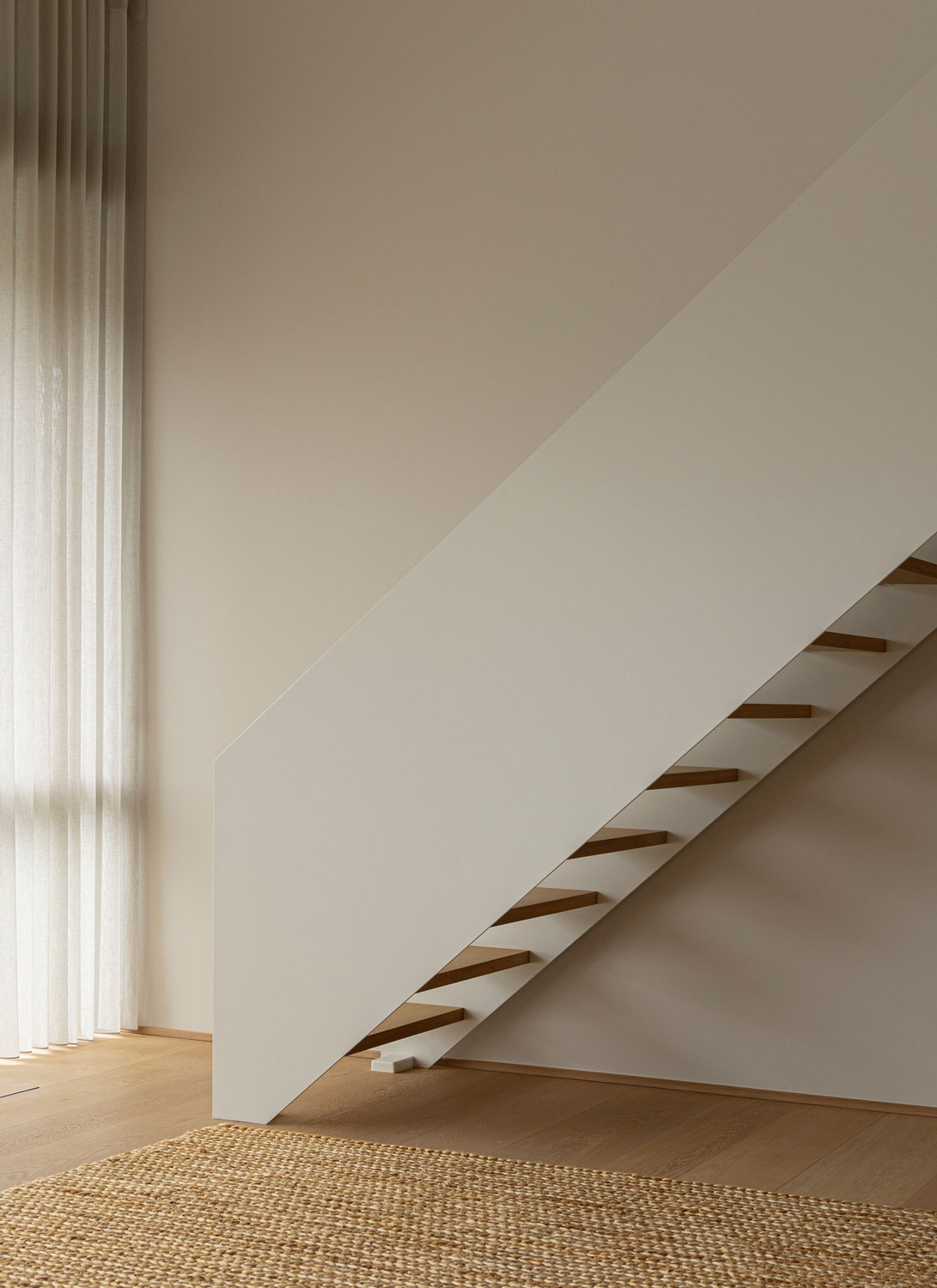 Внутри царит лёгкость: минималистичные формы, мягкие линии и природные материалы превращают интерьер в тихое убежище, где нет ничего лишнего. Панорамные виды за окнами становятся продолжением интерьера, а внутреннее убранство — спокойным холстом, на котором играет жизнь города. Эти апартаменты — не просто жильё, а место, где можно ощутить гармонию противоположностей: тишину и энергию, прошлое и современность, простоту и изысканность.
