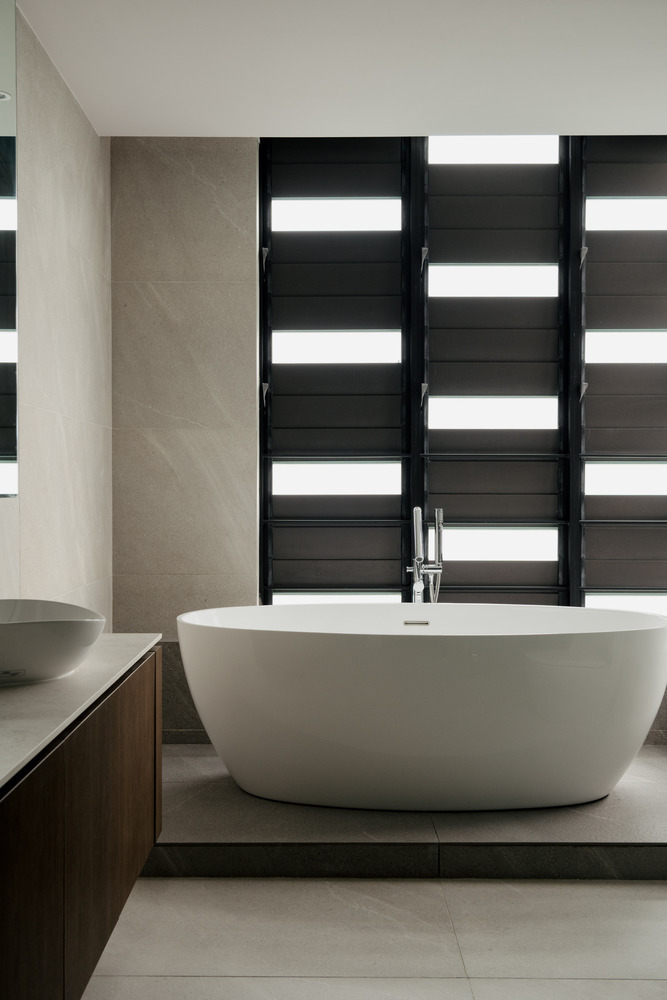 Ванная комната, выполненная в современном стиле, предлагает атмосферу спа, где каждый элемент продуман для максимального комфорта. Высококачественные отделочные материалы, такие как мрамор и натуральное дерево, создают роскошный вид, а продуманное освещение подчеркивает текстуры и формы. Уютное пространство для ухода за собой включает стильные раковины и душевые кабины, которые добавляют нотки элегантности и функциональности. Здесь можно насладиться расслабляющей ванной или освежающим душем, погружаясь в атмосферу спокойствия и уединения.