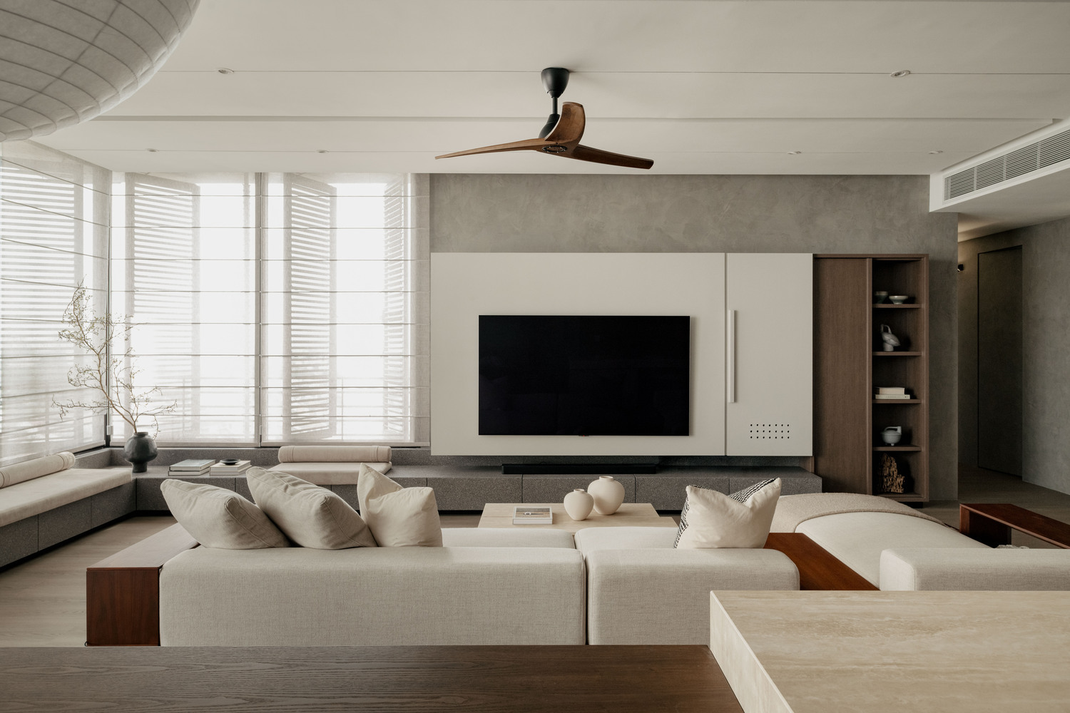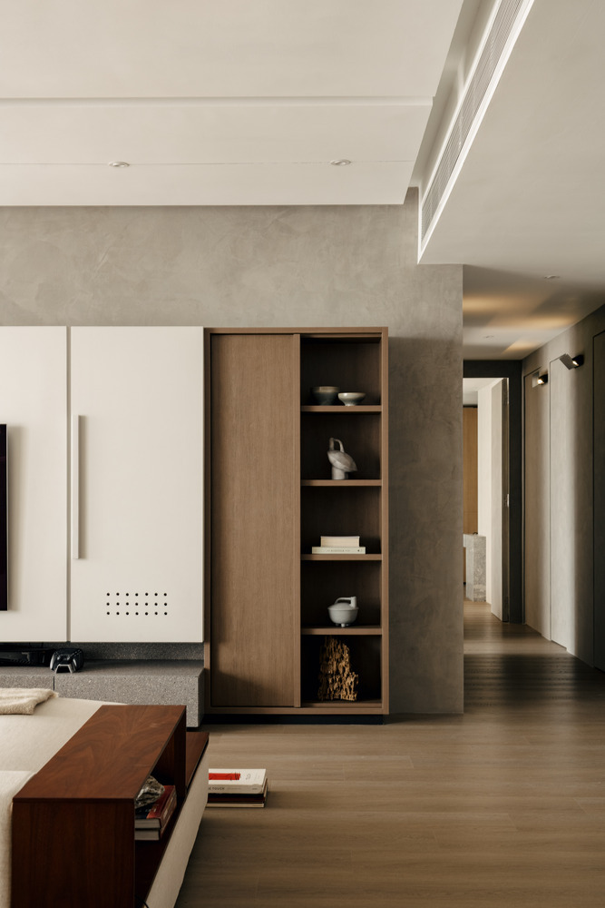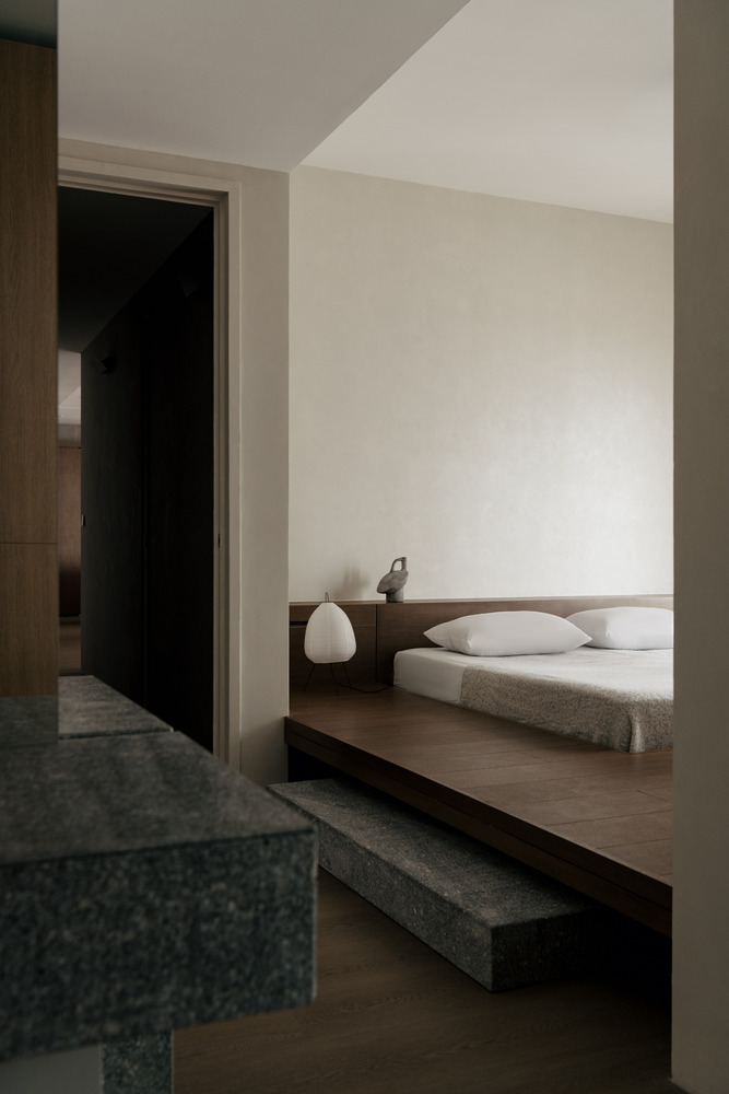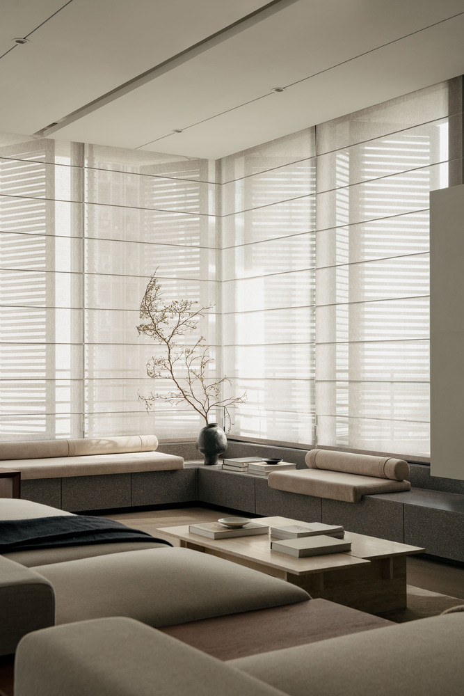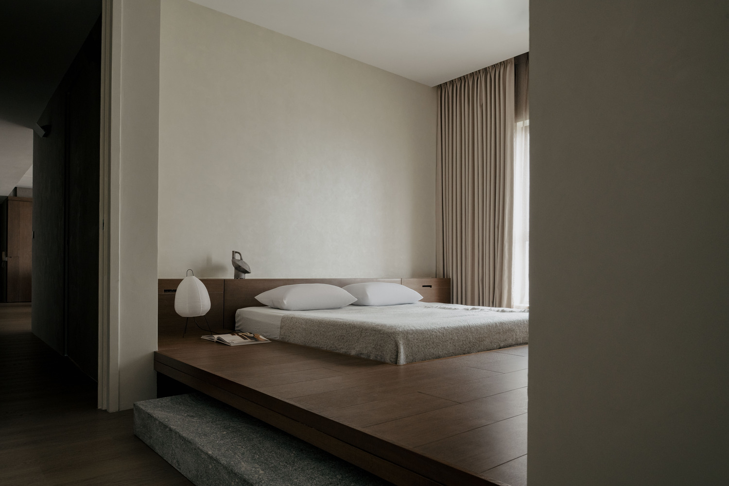 Спальня оформлена как уединенное убежище, где мягкие текстуры и спокойные оттенки способствуют расслаблению и отдыху. Здесь предусмотрены уютные элементы, такие как мягкие пледы и подушки, которые приглашают к отдыху и создают атмосферу домашнего уюта. Большие окна наполняют пространство естественным светом, а легкие шторы позволяют мягко рассеивать солнечные лучи, добавляя интимности и тепла.