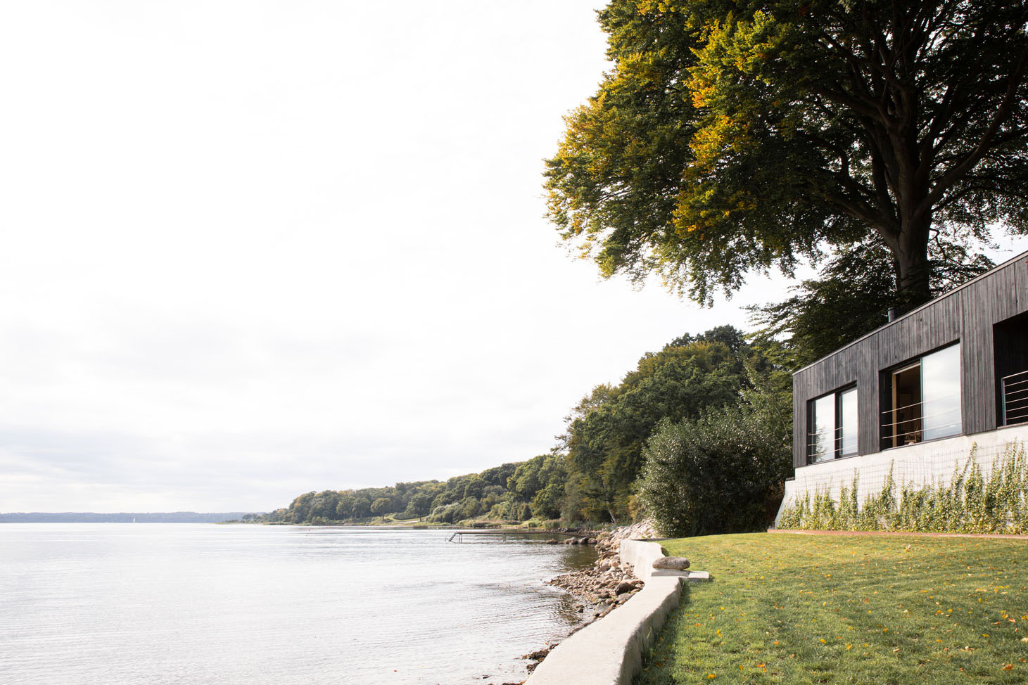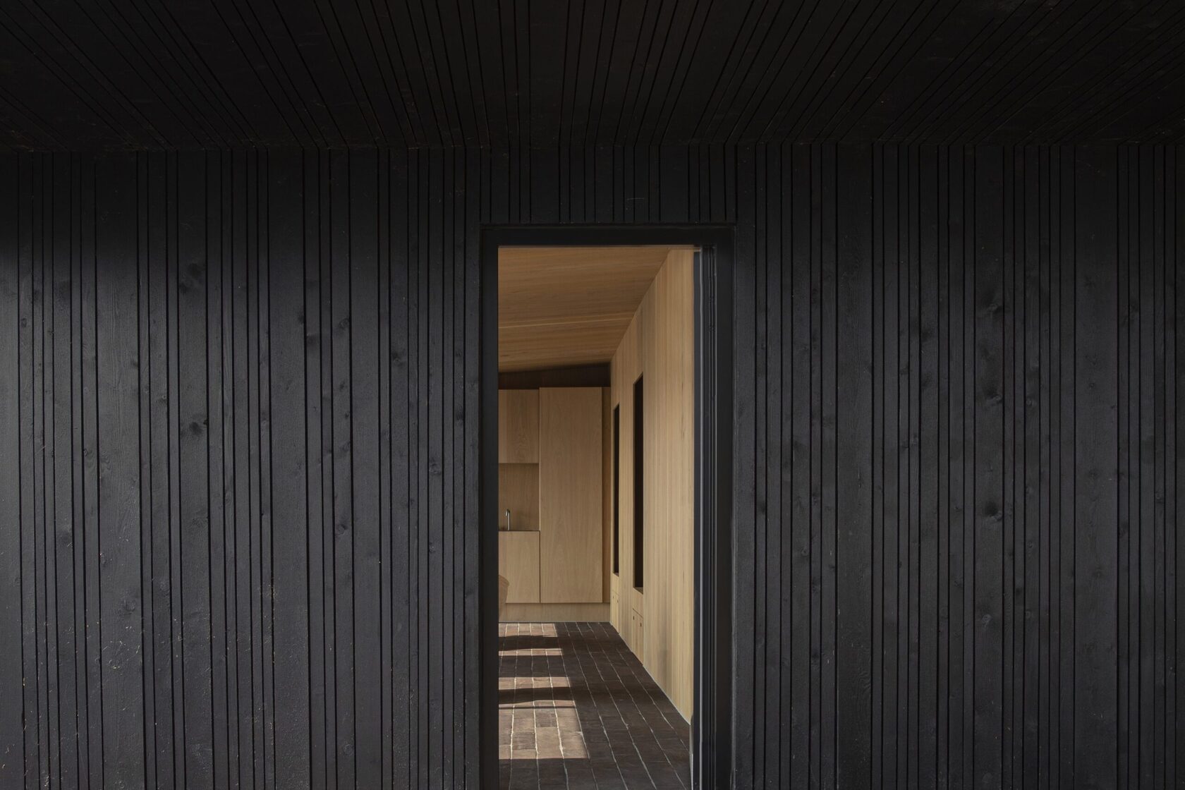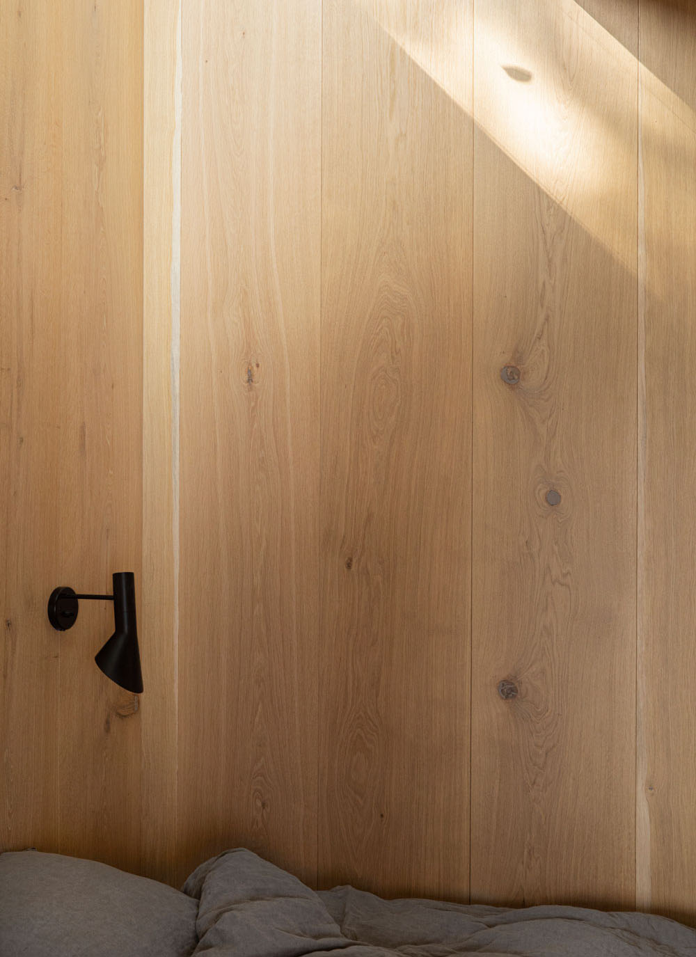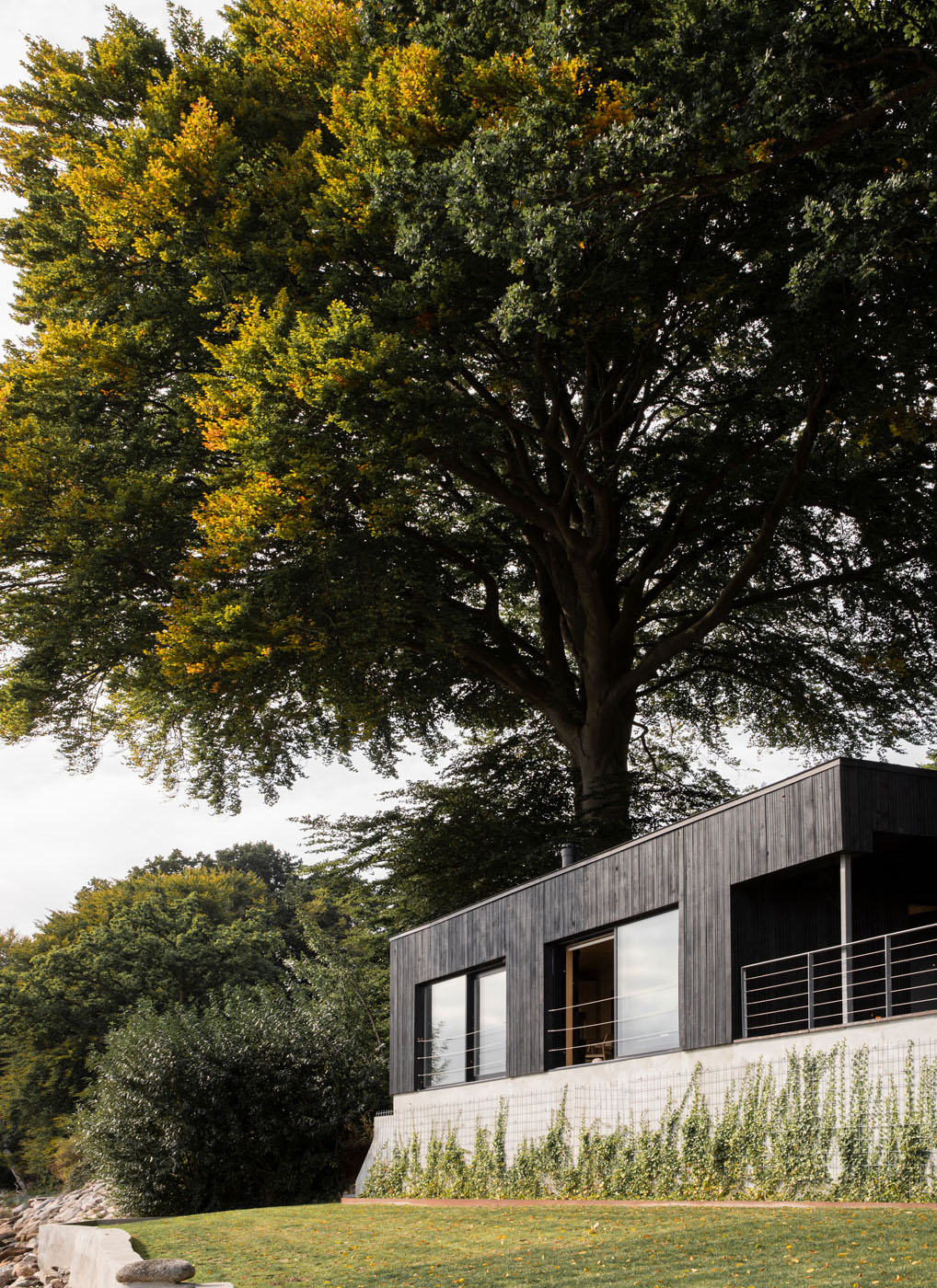 В интерьере используется изысканное множество теплых текстур и оттенков, создающих глубокое ощущение уюта и комфорта. В доме предусмотрены две спальни, расположенные на естественном склоне земли, что создает интимное пространство, напоминающее уютную каюту. Обе ниши определены большим световым окном, позволяющим природе и архитектуре взаимодействовать, впуская органичный свет и зелень внутрь.