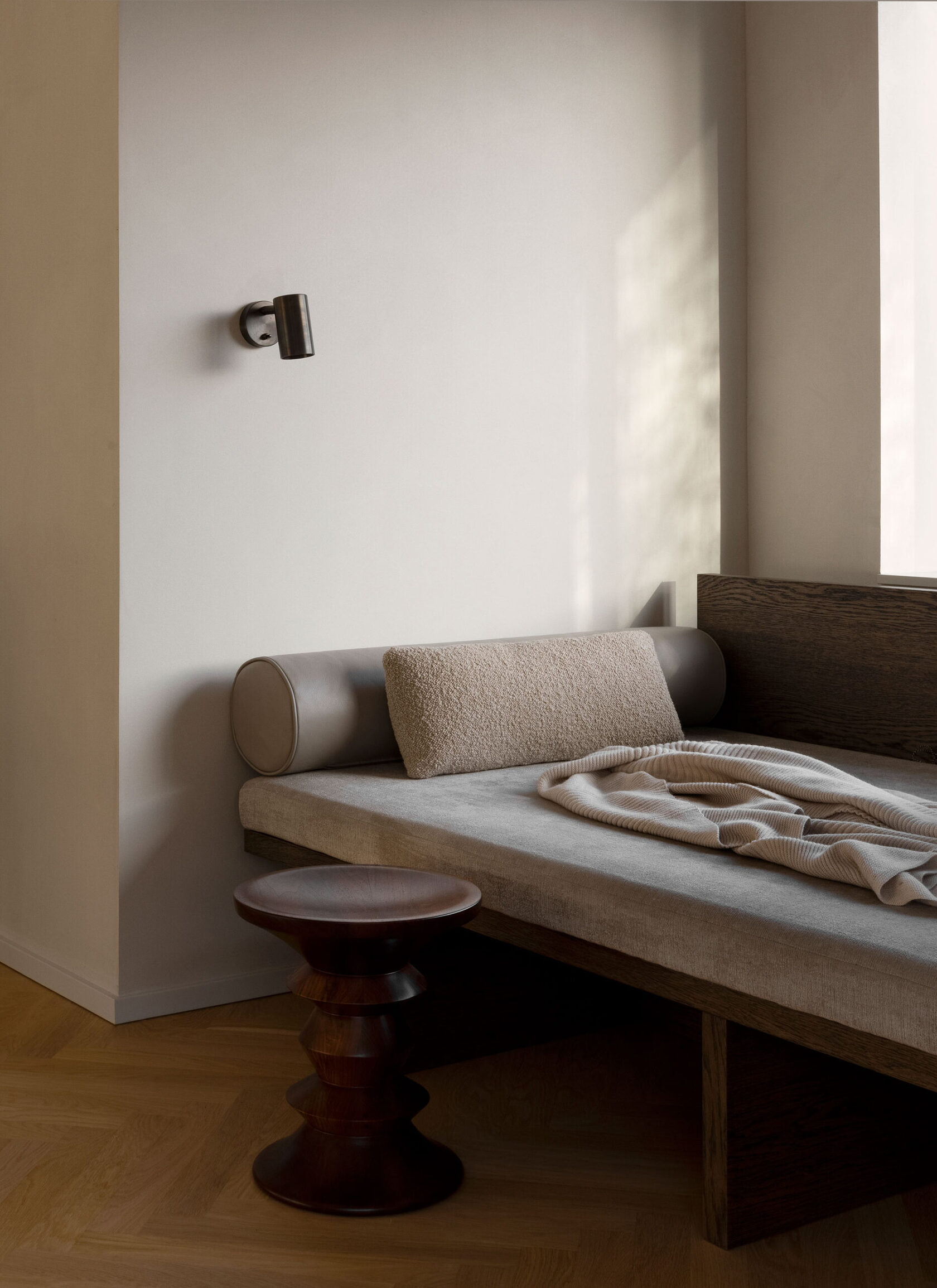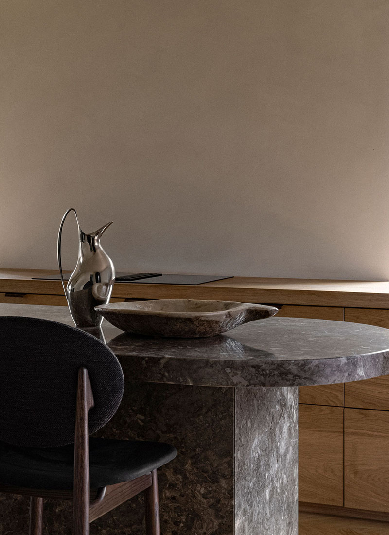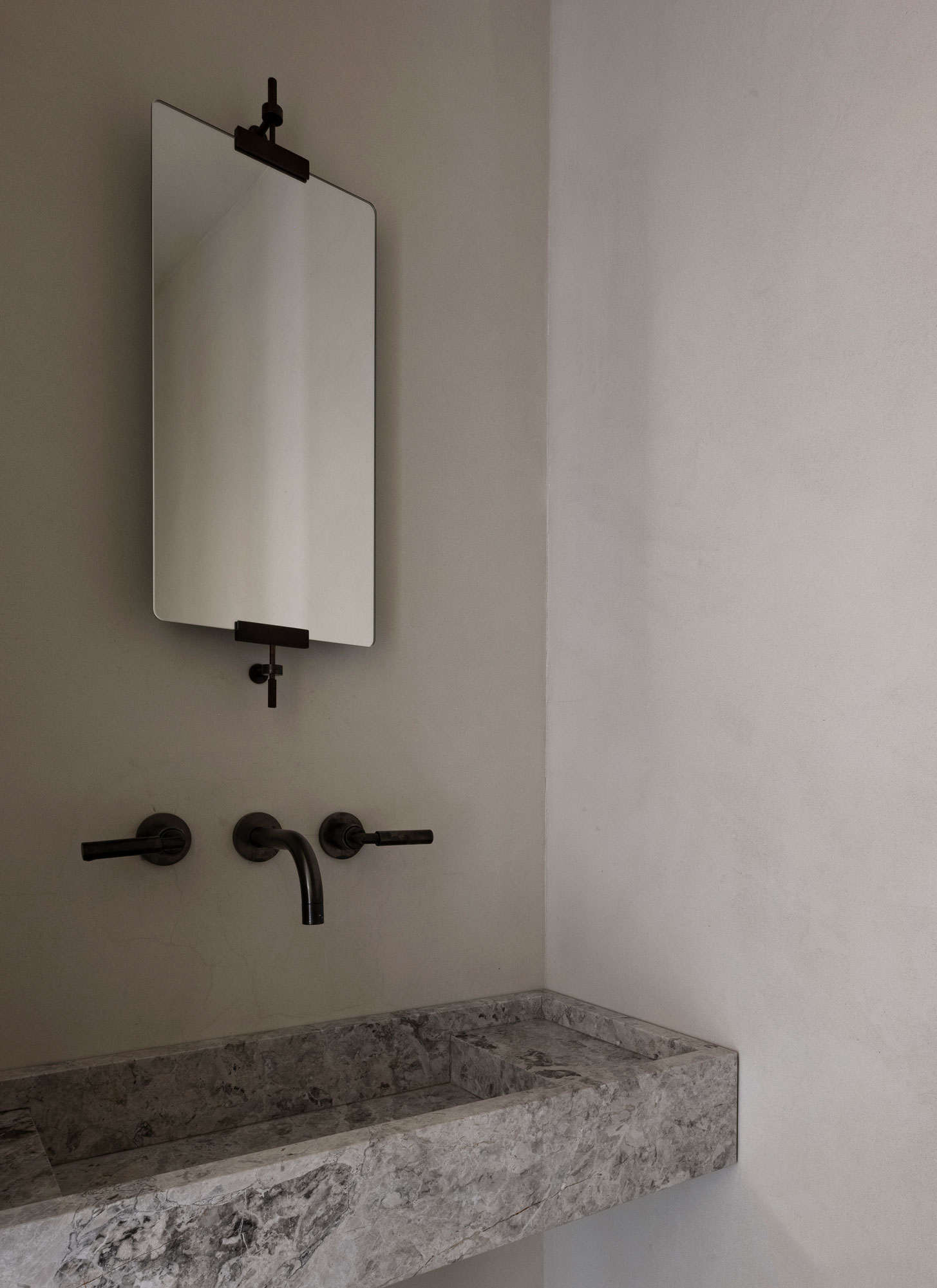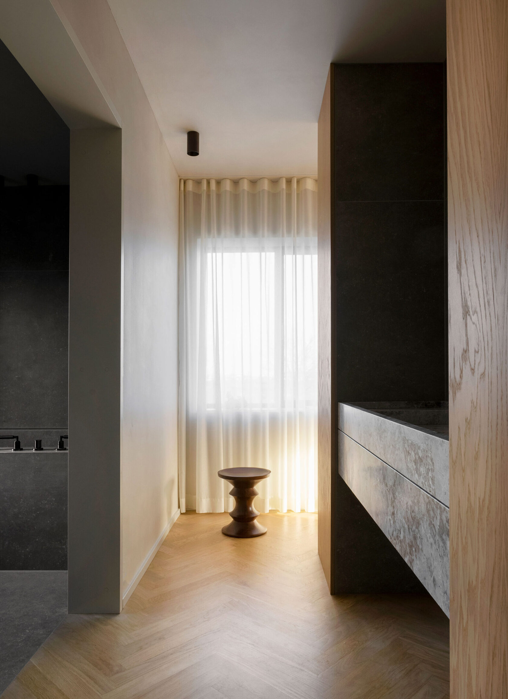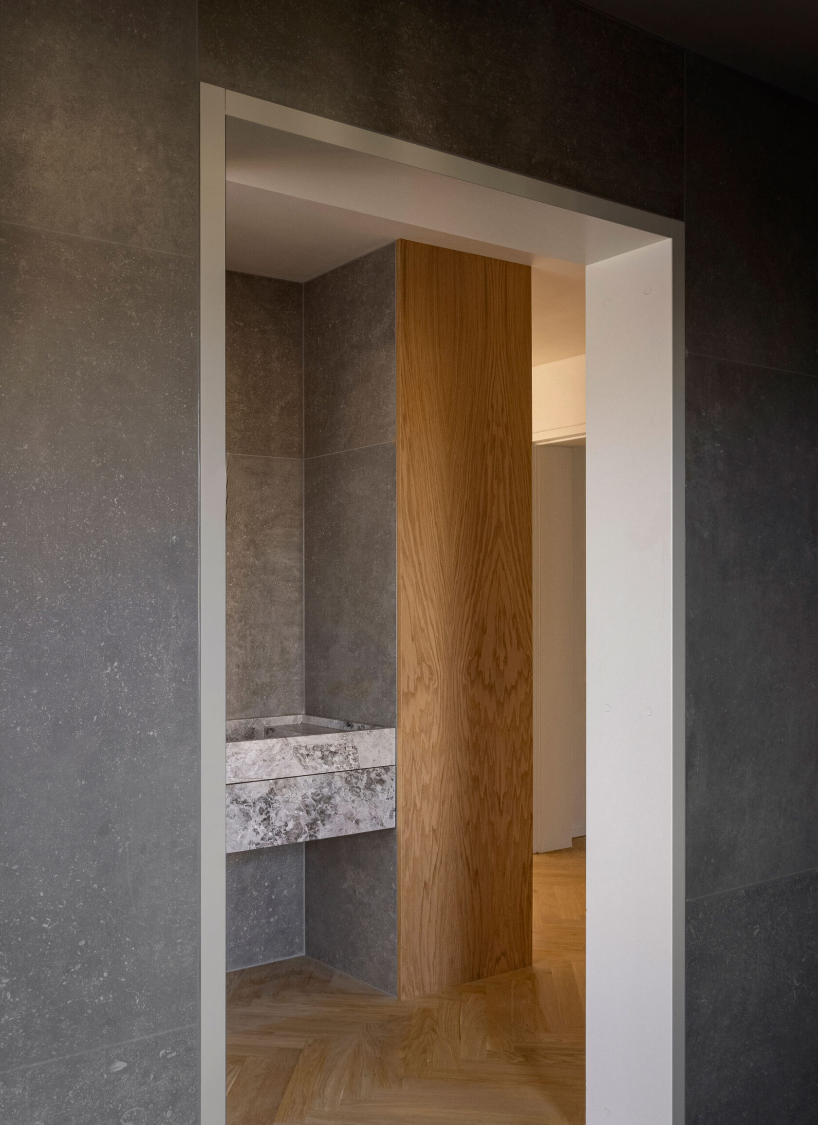 Чтобы добиться целостности пространства, некоторые элементы интерьера были выполнены на заказ — с осознанием того, что универсальных решений не существует. Эти индивидуально созданные композиции долговечны: они не только служат своей функции, но и учитывают контекст, органично вплетаясь в архитектуру, благодаря чему приобретают выразительность и придают особую ценность окружению.